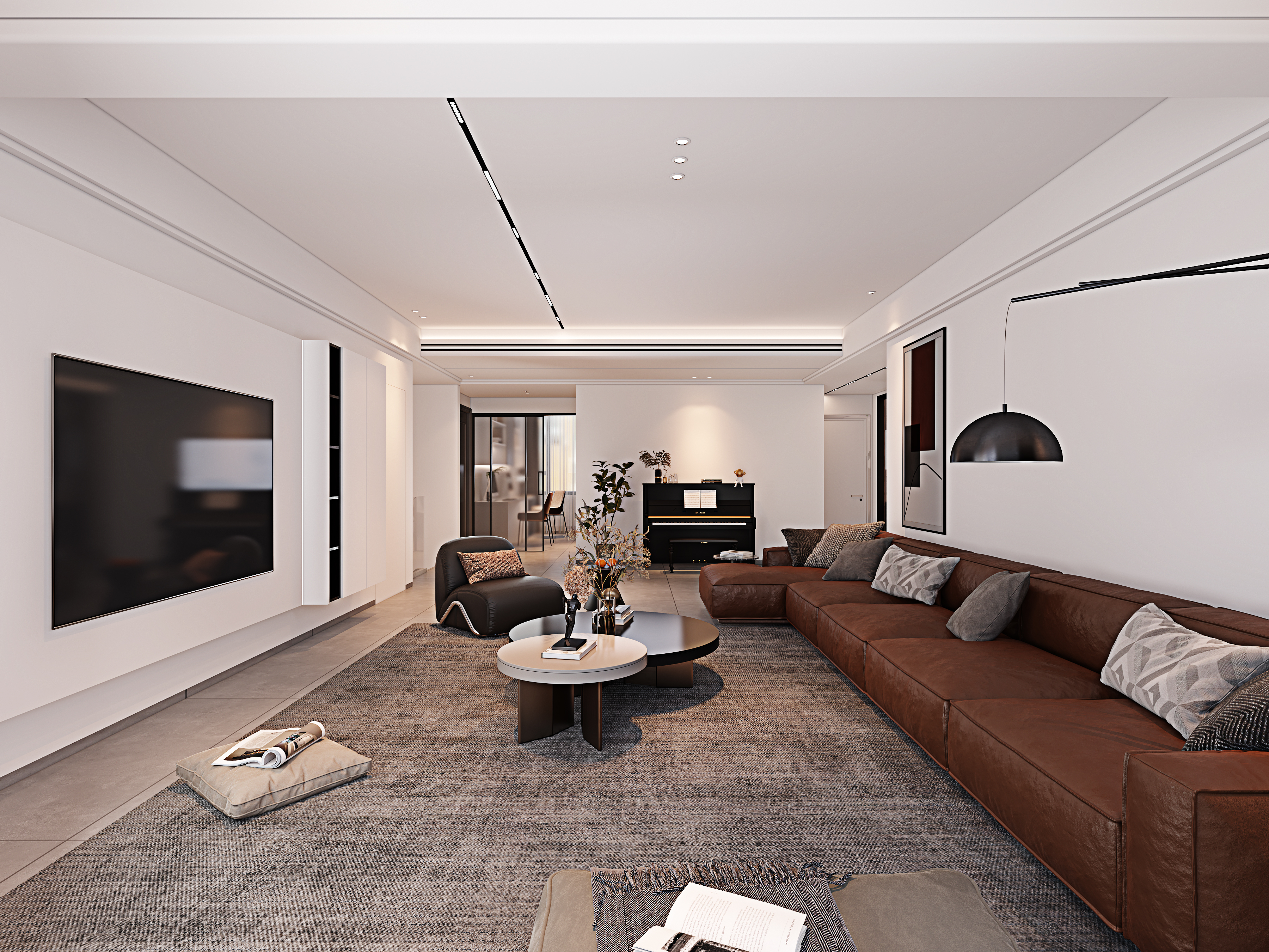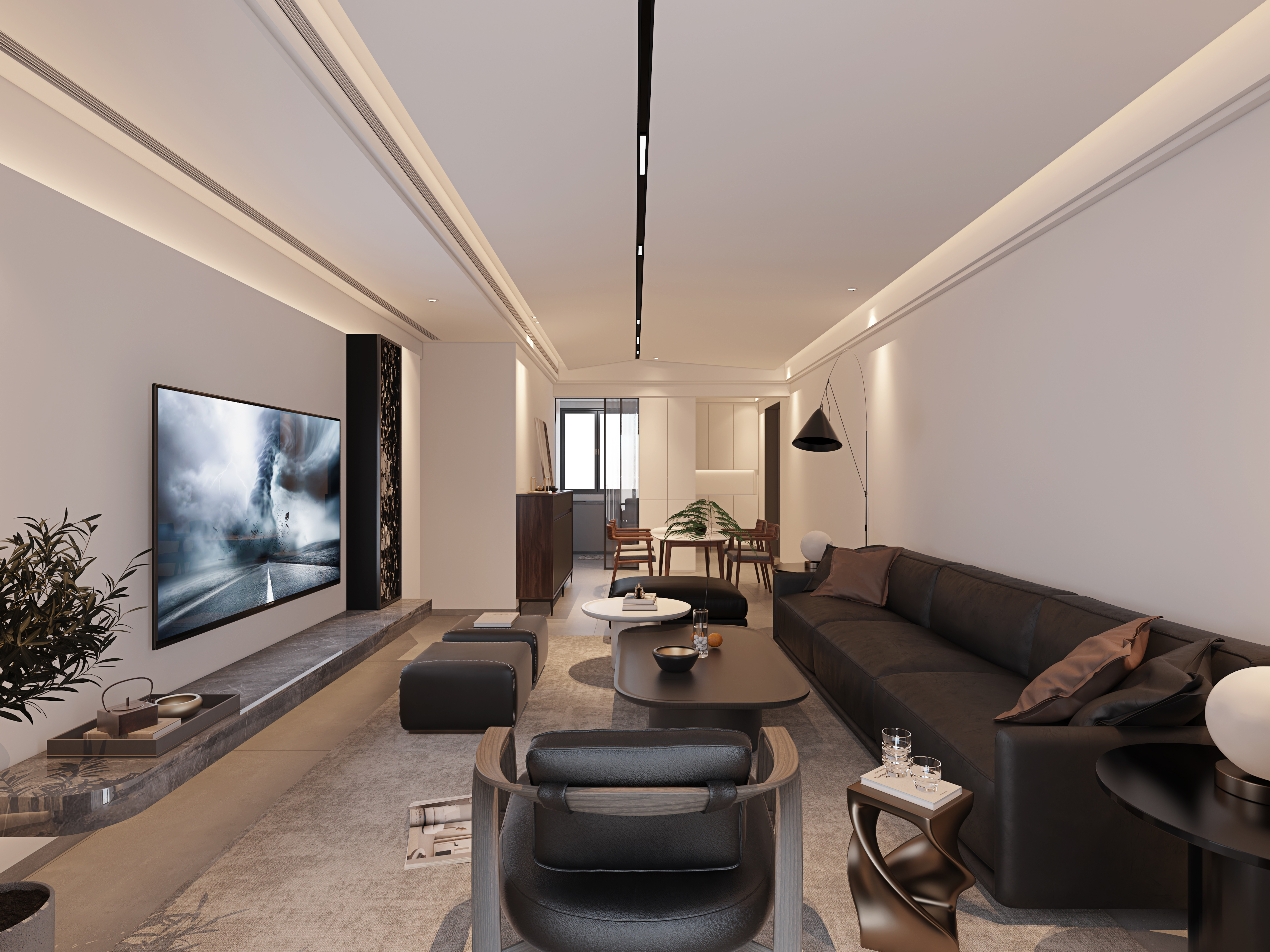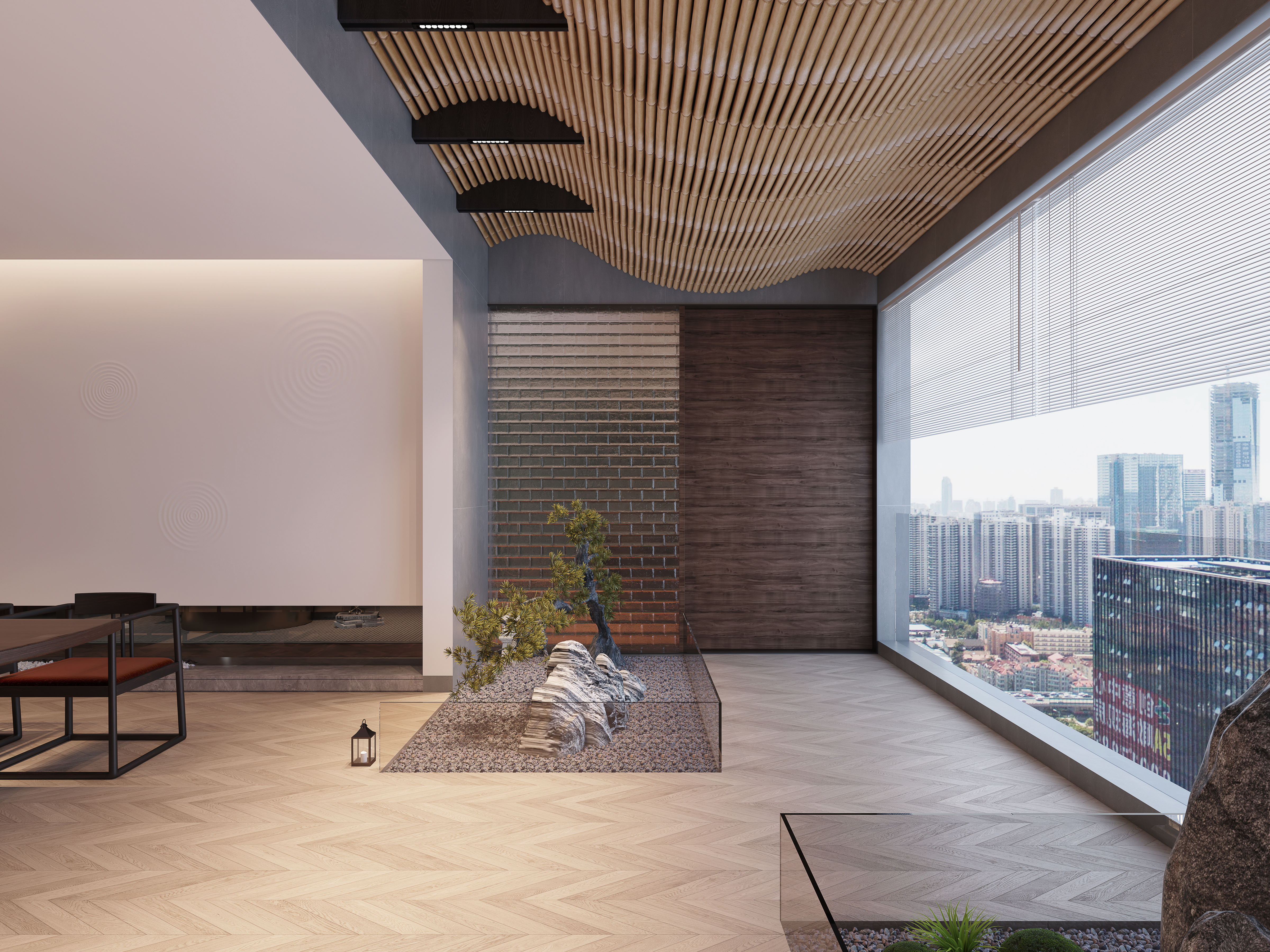 禅意中式茶室用于接待客户,搭配美式工业风风格的影音休闲室,用于忙后休闲。